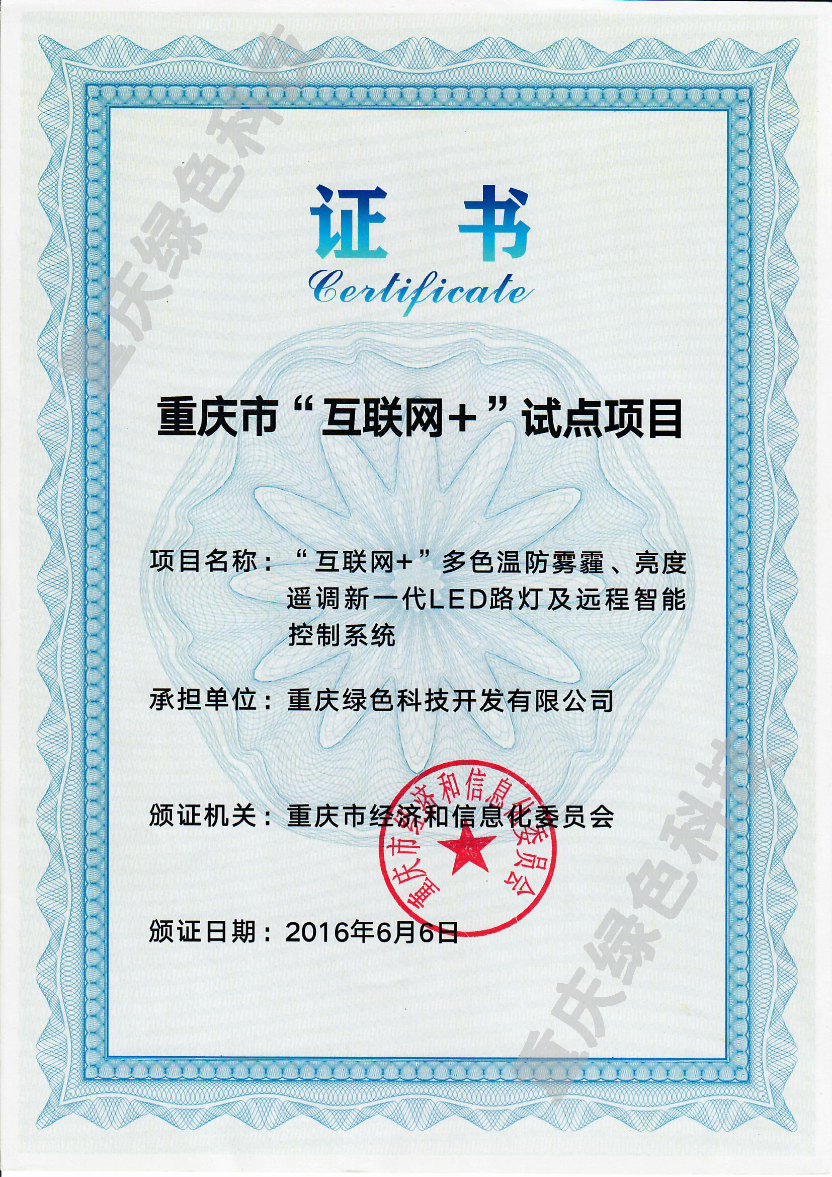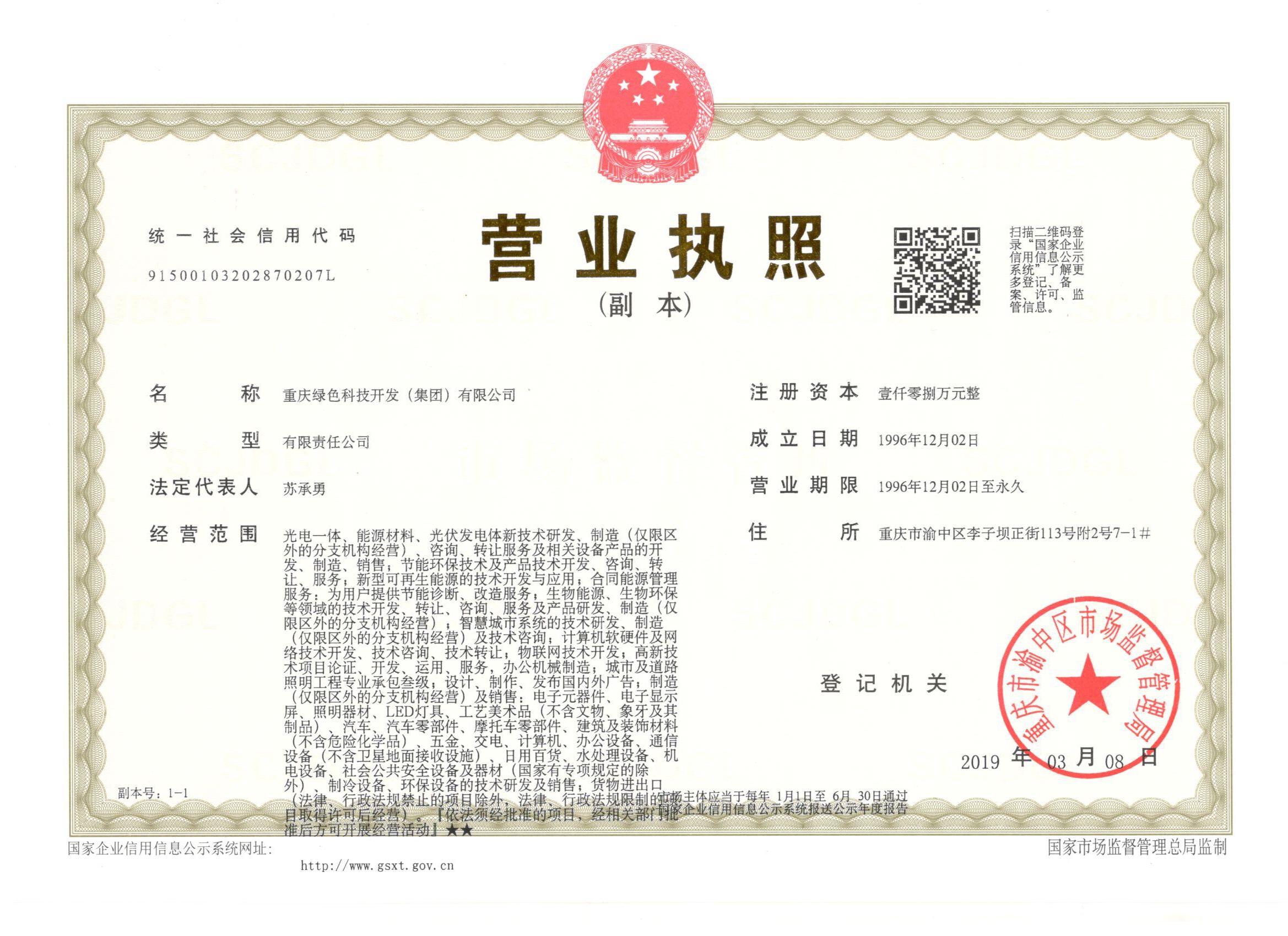 重慶綠色科技開發(集團)有限公司是國家高新技術企業、重慶市LED智能控制技術工程研究中心、重慶市中小企業技術研發中心、重慶市高成長性科技企業。擁有一支專業的多色溫LED智慧照明科研團隊,獲得國家發明等各類自主知識產權專利100余項。公司是以物聯網全光譜多色溫LED智慧路燈及“智慧城市”城市照明夜景燈飾聯動三級管理共享平臺為主要研發方向的現代科技型企業,經營銷售物聯網全光譜多色溫LED智慧路燈系列照明產品和教室照明護眼燈,推廣合同能源管理(EMC)照明節能改造項目、節能減排技術以及節能項目設計、融資、改造,咨詢服務、銷售、工程實施和技術推廣。